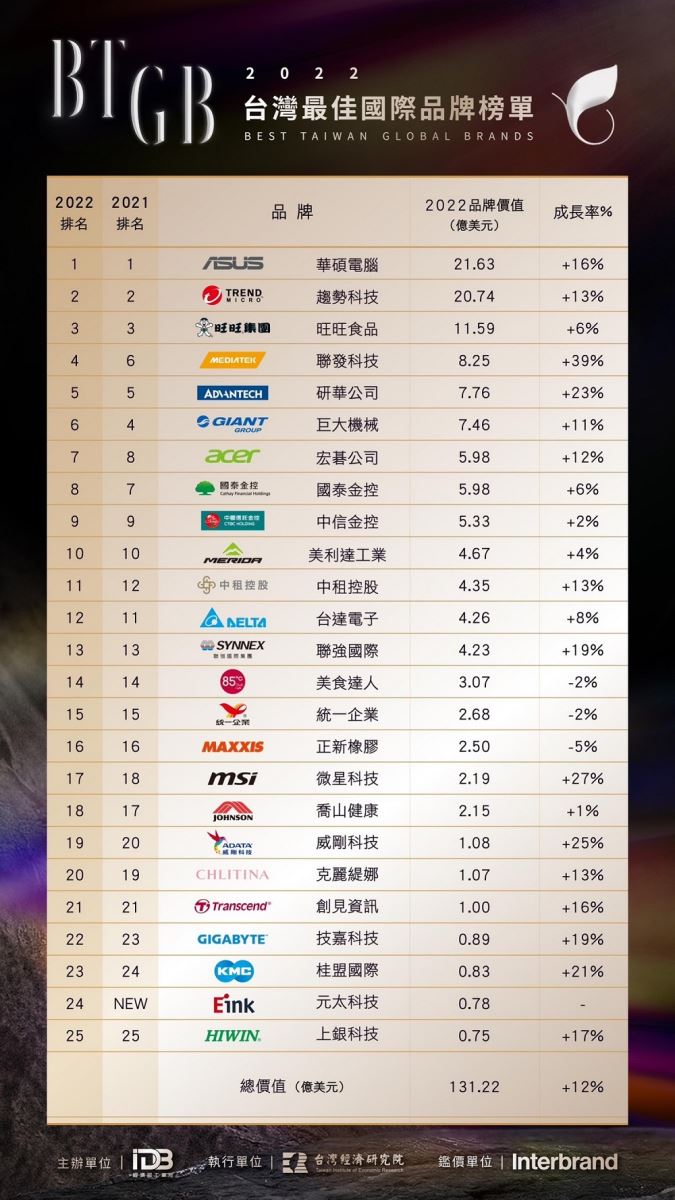 Nhiều thương hiệu Đài Loan vươn tầm thế giới mà nhắc đến tên có lẽ không ai không biết. Điển hình trong lĩnh vưc công nghệ như Asus, Acer, Advantech, MediaTek,… TSMC và Foxcon là 2 công ty nổi tiếng sản xuất chất bán dẫn và điện tử quan trọng của thế giới, là đối tác tin cậy của các công ty công nghệ toàn cầu điển hình là Apple. Trong lĩnh vực tài chính bảo hiểm thì có Cathay hay Chailease. Còn Giant chính là nhà sản xuất xe đạp lớn nhất thế giới đến từ Đài Loan; và còn nhiều thương hiệu nổi tiếng trong nhiều lĩnh vực khác nữa.
